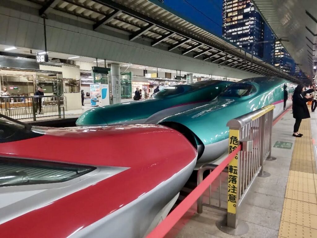 The red Shinkansen in the front is the Komachi, and the green one behind is the Hayabusa. From Tokyo to Morioka, they run coupled together. Then, at Morioka, the trains separate: the Komachi heads west to Yamagata, while the Hayabusa continues north to Aomori.